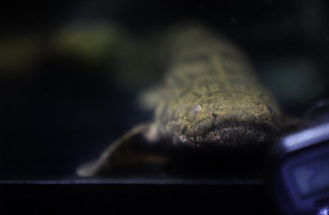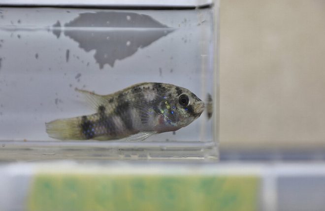 駆除係はこの子、トーマシー。「たぶんそんな名前だったかと(笑)」。どことなくプレコにも似ていて体長は4㎝ほど。ラムズの中身だけを食べて、殻だけポイするのだそう。メダカユーザーにとってラムズの大量発生は悩みのタネ。数年前にメダカユーザーから譲ってもらった個体で、「毎日しっかり仕事をしてくれています」。ただ、残った殻はいずれ回収しないといけないんですけどね(笑)。