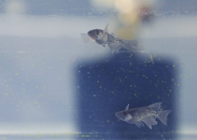 試作中のシロヘビリアルロングフィン。上見だと、ちょっとふっくらしていて可愛い泳ぎをしていました。このほかベーシックな定番メダカはもちろん、サバの極みやプラチナダイヤリアルロングフィン、鳳のダルマなんかも。