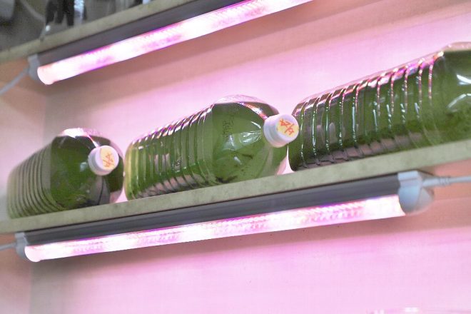 見上げれば、ミドリムシ。人工エサではないナチュラルなフードを適宜与えていることも、元気な個体作出につながっているのでしょう。