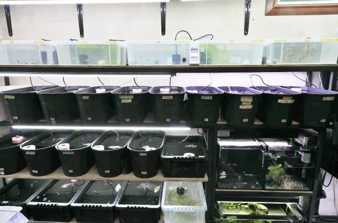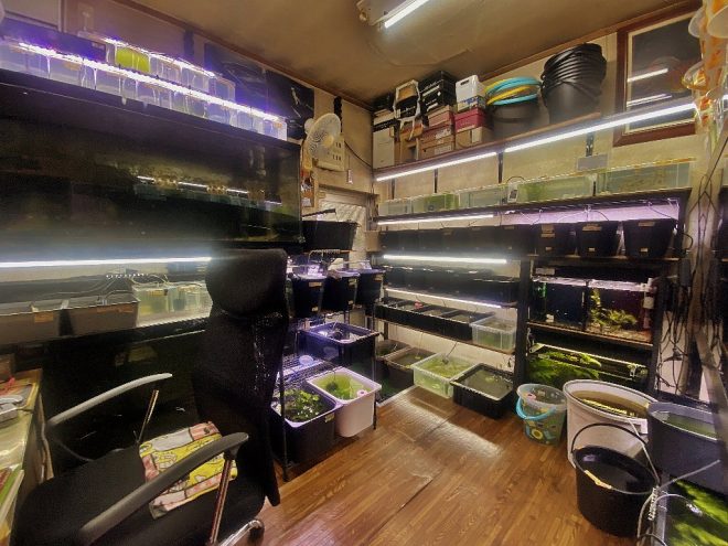 ひと通り飼育環境を見せてもらって事務所に通されたところ、エーッ!?「水温が30度を超えないように、ここだけは主にエアコンでコントロールしています」。いやいや、そうじゃなくて(笑)。てっきり事務所だったと思ったのに、完全にメダカに占領されているじゃないですか!「いや、メダカ以外の個体も少しいますよ」。いや、だーかーらー(笑)。