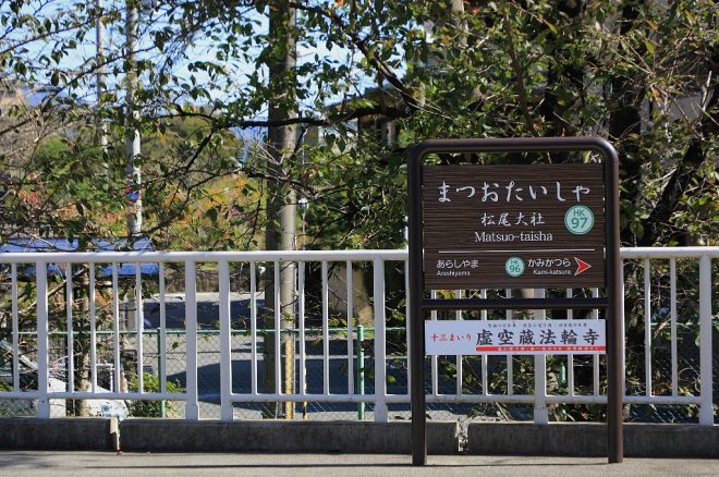 松尾さんの名で親しまれている松尾大社。駅の名前もそのものズバリ。5世紀ごろに朝鮮から渡来した秦氏がこの地に移住、山城・丹波の国を開拓したといわれています。開拓当時は丹波地方は湿地帯だったそうで、河川を治めて農業や林業をおこすには大変な苦労があったことでしょう。