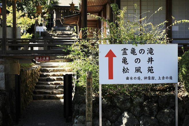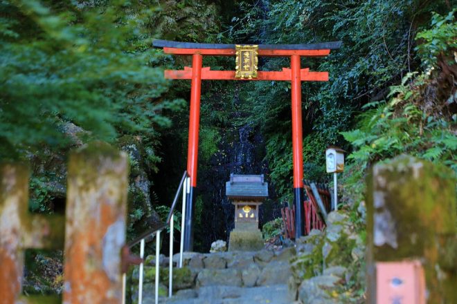 コイといえば滝のぼり。もしかして奥に滝があるのでは?そんな素朴な疑問を持って進むと予感的中。やはり滝がありました。この滝と神使とされるコイのつながりはわかりませんが、滝のさらに奥には磐座(いわくら)が今も置かれるなど、古代の信仰が厚かったことがうかがえます。