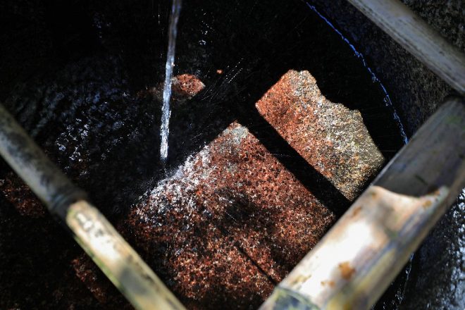 松尾山から水とともに微量の砂を運んでくるらしく、井戸の底に赤いものが溜まっていました。