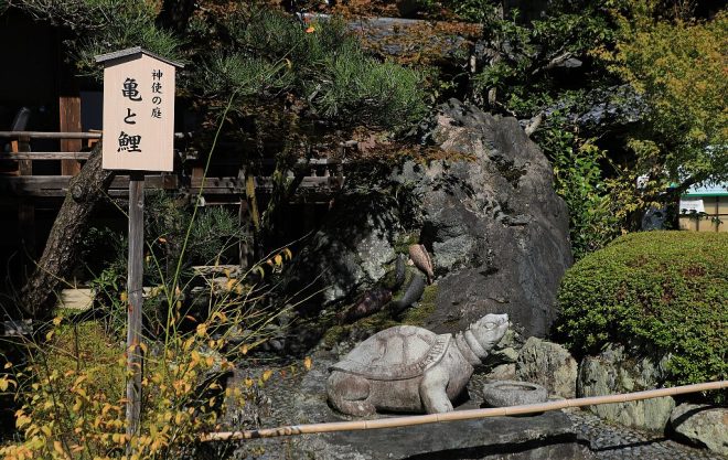 松尾大社の境内にある神使の庭のカメとコイのオブジェ。神道ではさまざまな動物が神様の使いとして活躍しています。カメは比較的有名ですが、コイまでも神様の使いということなのでしょうか?この何気ないオブジェが、このあと大きなドラマへと続く序章だったとはこの時は知る由もありませんでした。
