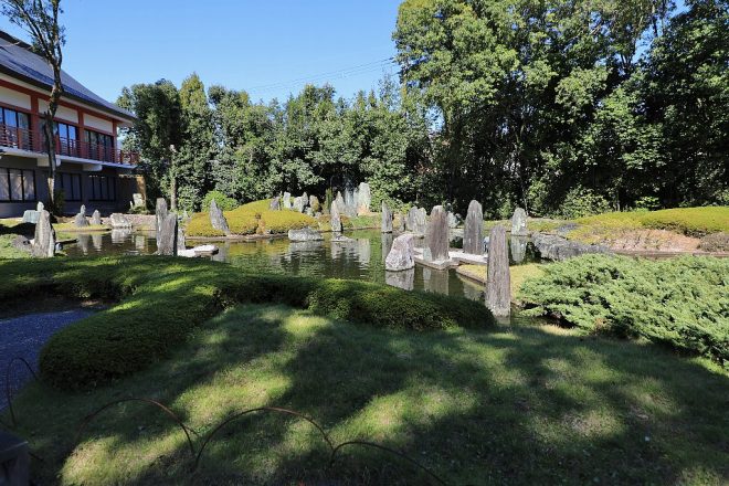 重森三玲が池のかたちを指示し、その後長男がその遺志を継いで完成させたという蓬莱の庭。不老不死の仙人が住むという蓬莱の島を池中に配し、池全体が翼を大きく広げたツルの姿をなぞらえているそうです。最初で最後の親子合作の庭園は、ひっとりとしていました。