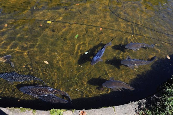 やっとコイ発見。神使のコイにエサをあげてしまいました。お食事といったほうがいいのでしょうか?コイらしく、撒かれたエサに群がっていました。そこは神使といえどもコイはコイでした。