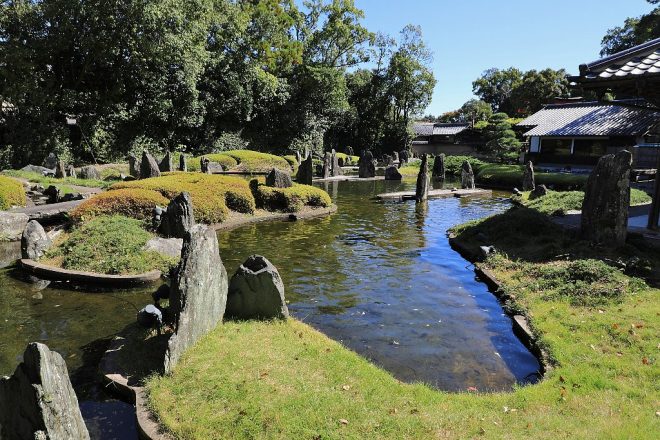 圧倒されるほどの美しさ。ひと目見ただけで曲水の庭とわかる絶妙な構成。洲浜と曲水の流れは石組を使って動と静を巧みに表現した重森三玲らしい庭の構成。サツキの季節はさらに彩りが加わり、美しさが増すことでしょう。