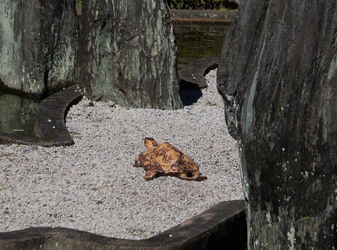 池中の島にカメの姿がありました。そこは蓬莱の島?そして神使のカメでしょうか。