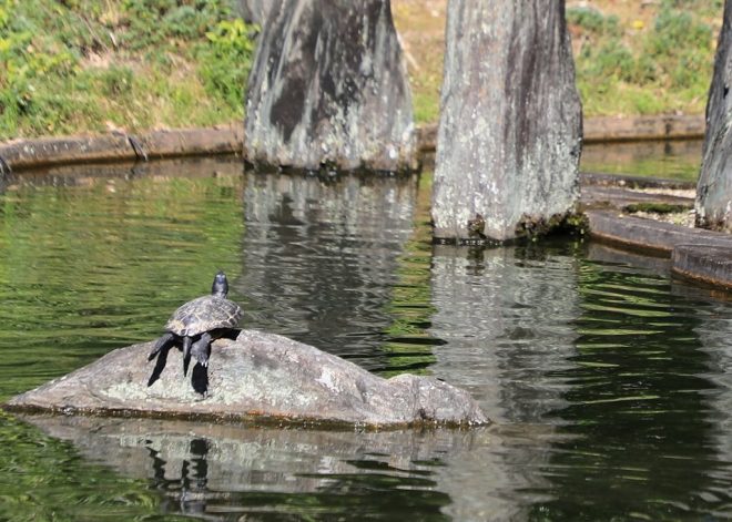 一瞬置物かと見間違えるくらいじっとしていたカメ。優雅に日向ぼっこ中。気持ちよさそうに足を伸ばす姿が何とも可愛い。