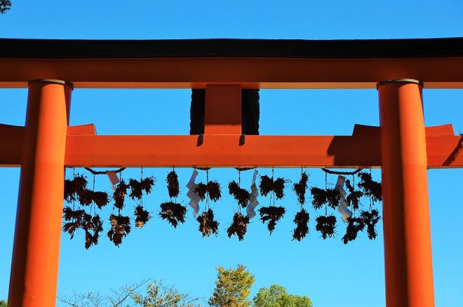 土木・養蚕・機織の技術を日本に広めていった秦氏。この地を開拓した秦氏も、その後川を遡り、開拓を続けていったといわれています。松尾大社の鳥居には農作物の出来不出来を占うう榊(さかき)の葉の束が下げられていました。こんな鳥居を見たのは初めてです。