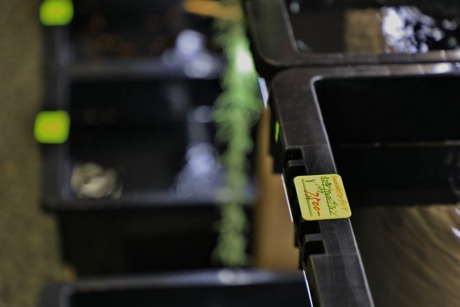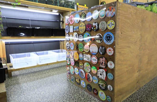 これは一体?「メダカ愛好家のみなさんオリジナルのステッカーです。名刺代わりにつくって配っておられますよ」。そうなんですか。いつからこんな習慣が?メダカだけですよね?「う~ん、私もよく知らないんです(笑)」。へー、これは知りませんでした。約10㎝四方のステッカーには、個々の特徴がデザインに反映され、これだけズラリと並んでいるとなかなか壮観。どういうわけかメダカ愛好家の中でちょっとしたブームになっているそうで、いつ誰がどのタイミングで始めたのかまったく不明。もし知ってる人がいたら、ぜひ教えてください(笑)!