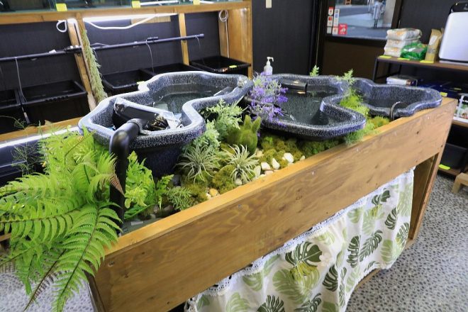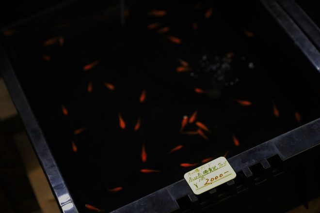 まず目に飛び込んでくるのは、プラ舟で立体的に構成されたメダカ池。ある意味、店のアイキャッチ的存在。これがあるのとないのとでは大違い。日本庭園という店舗イメージとして、店内の大きなアクセントになっています。