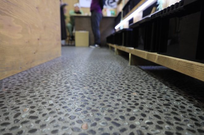 日本庭園のイメージはこんなところにも。天然石風のソフトタッチの床材。これなら万一メダカが水槽から飛び出すことがあっても、大ケガをすることはなさそうです。
