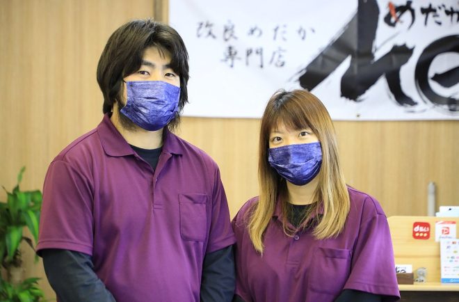 出迎えてくれたのは、桃田一成さんと桃田雅奈未さん。2人とも30歳を超えたばかりの若夫婦。以前同じ職場にいた者同士であり、そして今はメダカ大好き同士。「最初はまったく興味なかったんですよ。飼育が簡単なことは知っていましたが、メダカって川にいっぱいいるやつやん!って(笑)」と雅奈未さん。その後、一成さんの自宅のベランダがメダカに占領されているのを唖然としたり、ネットオークションで30万円もするペアを見て驚愕したり。一成さんとの縁はまさにメダカとの縁でもありました。