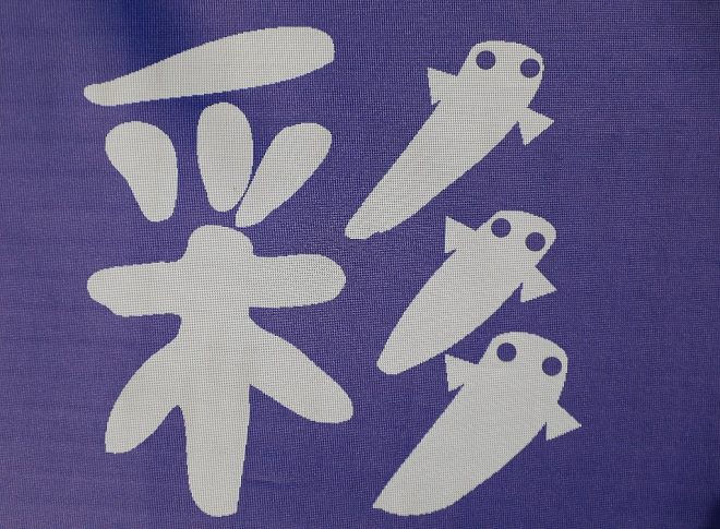タペストリー調の真新しい看板は、ロイヤルブルーがベースカラー。