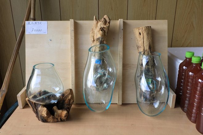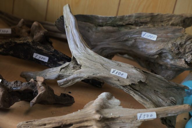生体以外に流木ガラスやPSBといわれるバクテリア、自らが調達してきた流木など、販売用の小物も少しずつ増えてきました。