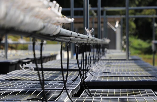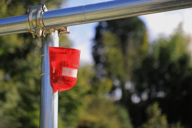侵入者を感知すると赤く光る防犯灯も2台設置。幸い今まで盗難に遭ったことはありませんが、今はメダカブームですから何が起きてもおかしくはありません。自然環境に恵まれたメダカファームだからこそ、侵入者に対するセキュリティも必然です。