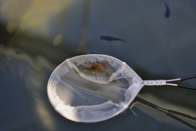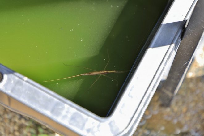 正体不明のラスボス(笑)?タガメかコオイムシかよくわかりません。体は小さいのに、大きなカマで不気味にメダカを襲います。このようなメダカの敵を、くまなくパトロールして見つけて駆除するのも塚本さんの仕事。とはいえ、ヤツらは水中に潜んでいることが多くなかなか水面に出てこないので、確保するにも大変。自然にことのほか恵まれていますが、メダカを脅かす悪党たちもたくさんいます。