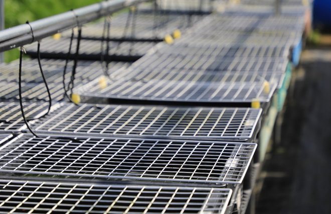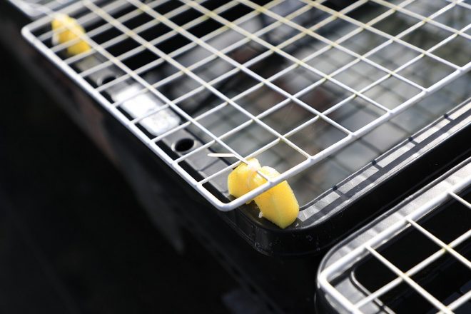 トロ舟(飼育容器)はざっと200個はあります。70種類以上の改良メダカを飼育中ですが、すべてのトロ舟は金網でガード。これなら、ヤゴの発生も予防でき、トンボの産卵も防ぐことができます。