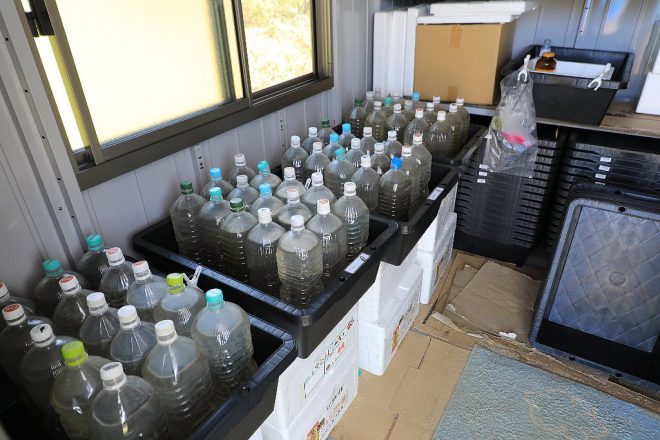 万一病気になったメダカは、こことは別にメチレンブルーと塩を入れて完全隔離。4~5日すれば回復するそうですが、日照時間が短くなるとどうしても病気になりがちなのだとか。