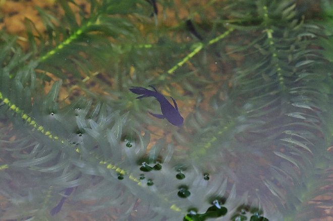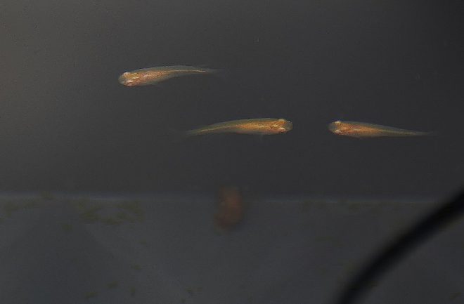 黄金色に輝くメダカ3匹。「黒メダカから突然変異で生まれた個体なんです。黒メダカを交配した300匹のうちの3匹だけがこの色だったんです」。ということは、100分の1の確率で生まれた貴重な3匹。何か後光がさしているような気も(笑)。