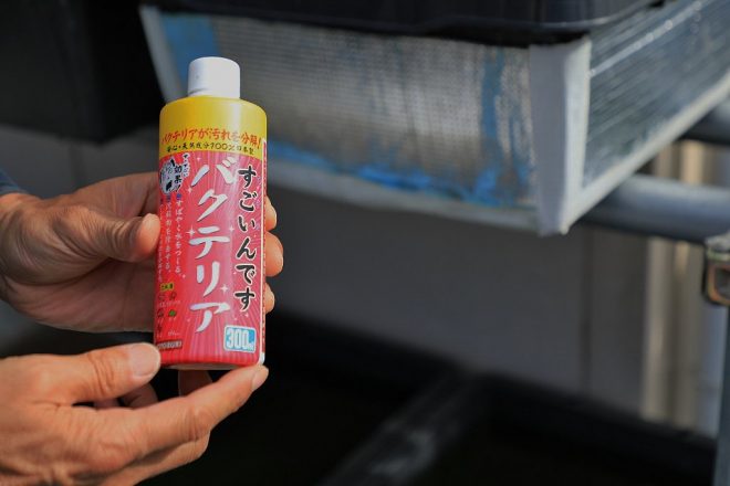 お、KOTOBUKIの「すごいんです」シリーズのバクテリアですね。地元のファーマーズマーケットでメダカを出品する前に使ってみたら、数日間水がまったく濁らなかったんです。バクテリアが豊富で、アンモニア分解に貢献してくれました」。鈍川せせらぎ水族館でもKOTOBUKIとの出会いがありましたが、ここでもこうしてお役に立てて光栄です(笑)。