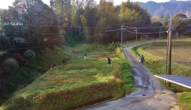 着いたところは、田んぼを造成してできたメダカの飼育場。まさにメダカファーム。今治市中心部から車で約30分という立地で自然がいっぱいです。あちこち田畑が広がり、メダカを飼育するには絶好の環境です。