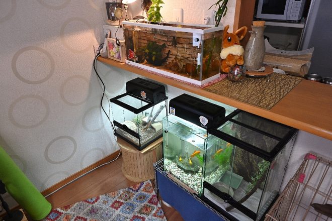その後もプラチナホワイトエンゼルフィッシュ、カージナルテトラ、オトシンクルスなど、いわゆる熱帯魚全般の飼育経験も。「ベタ飼育は何度かチャレンジしてみたんですけど、なかなかうまくいかなくて。ちょうどこの子(四男・岳君)の出産とも重なり、アクアをお休みしたこともありました」。