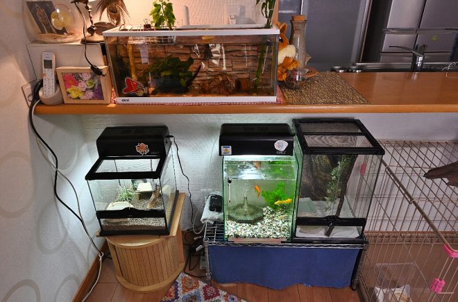 こちらはメダカ、金魚、そして両生類や爬虫類。バラエティーに富んでます。