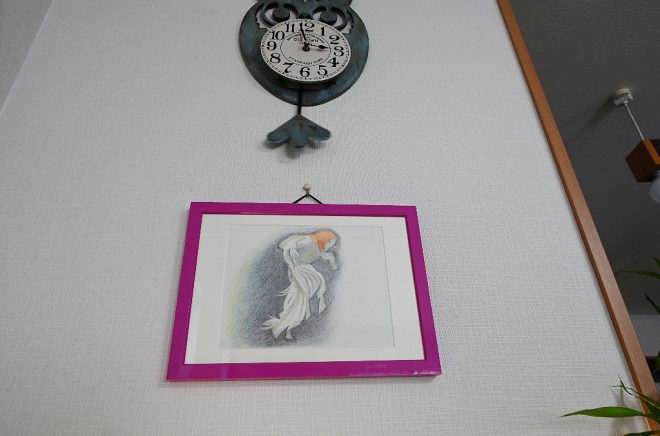壁に飾られた1枚のリュウキン(丹頂)の絵。「ああ、それは去年まで生きていた紅(コウ)です。私はオコウと呼んでました」。ということは、残念ながら遺影になってしまったんですね。