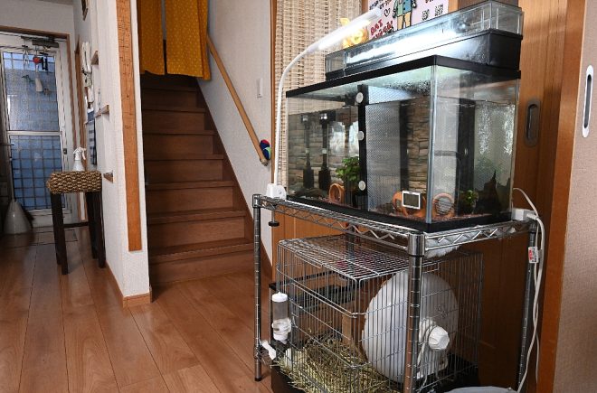 それではお邪魔します。リビングには、複数の水槽が2カ所に分けて設置されていました。こちらのメインは古代魚。水槽だけでなく小動物用のケージもあります。