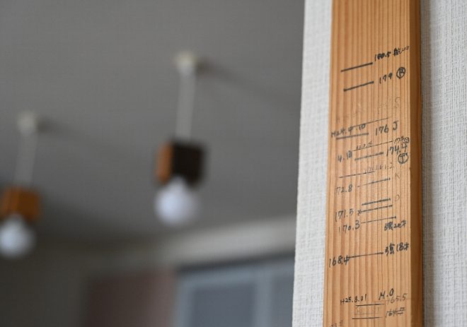 アクアはなかなかうまくいかないことが多くて何度も挫折。「必死で勉強しました。自分に欠けてたスキルは何だったのかという反省も。もう自分の子育てを忘れてしまうくらいに(笑)」。ちなみに溝田家は6人家族。お子さんはすべて男子。今では立派に成長した証が、リビングの柱にも残っています。