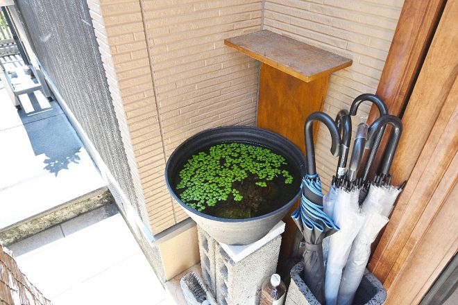 玄関前には睡蓮鉢が。何気なく簾がかけられたシーンはまさに日本の夏。目を凝らしてみると、暑さにめげることなくメダカがスイスイ泳いでいました。これが溝田家のアクアへのプロローグだったりなんかして(笑)。