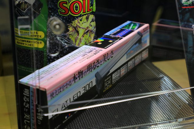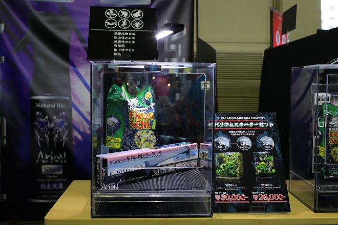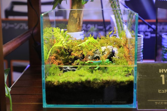 8月に発売されたばかりの新商品・コンパクト水槽「レグラスネイチャーシリーズ」も展示。メダカなどの小型魚飼育にも適した水槽ですが、ブースではミニテラリウムで演出。ちょっとした爬虫類も添えられていますが、あくまでフィギュアなのでお許しを(笑)