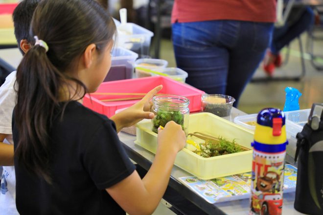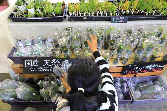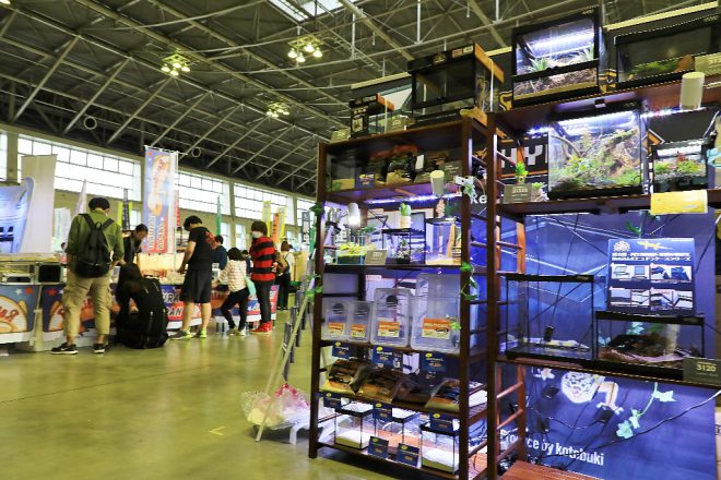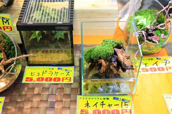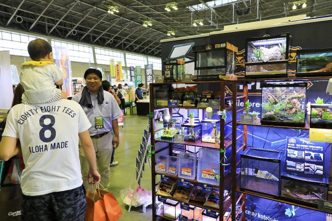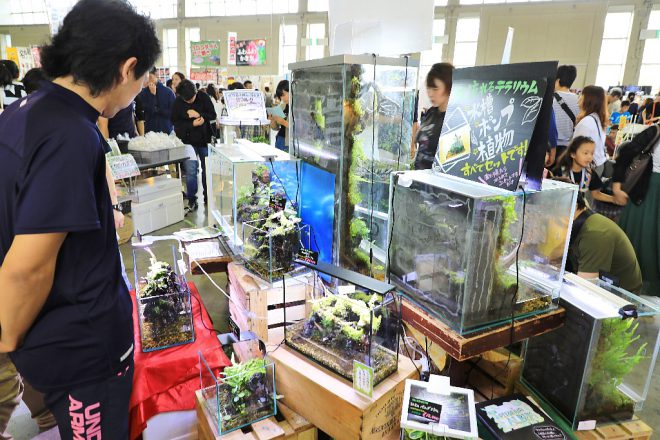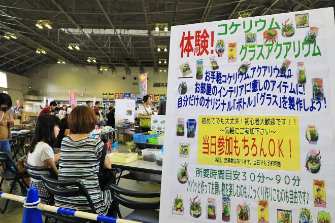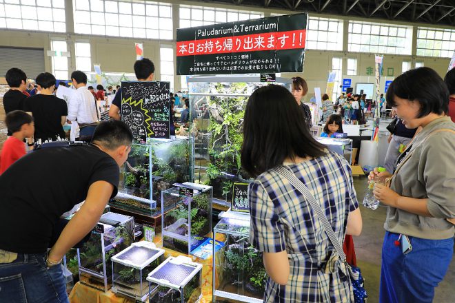 ブースのメインでは、水を使わないボトルコケリウム、水を入れて場合によっては小魚も使うグラスコケリウム、そして湿地の爬虫類生息地を再現するパルダリウムなど、各種ワークショップを開催。広さは十分。服部真一店長によると、「今回のテーマはずばりコケなんです。お客様にワークショップで体験していただくことで、コケリウムなどに関心を持っていただければ、と企画しました」。その思いはドンピシャで、つくったものをお持ち帰りできることもあって、どの時間帯も親子やカップルなどでにぎわっていました。