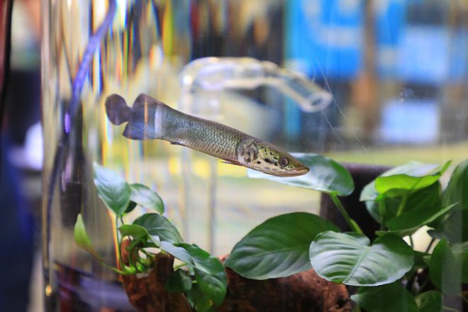 本イベントで遭遇したお魚第1号!南米のアマゾン川流域に生息するピラルク。この日は一匹だけでしたが、水槽内をゆうゆうと泳いでいました。ほらほら、爬虫類だけでなくやっぱり魚も人気ありますよ(笑)!