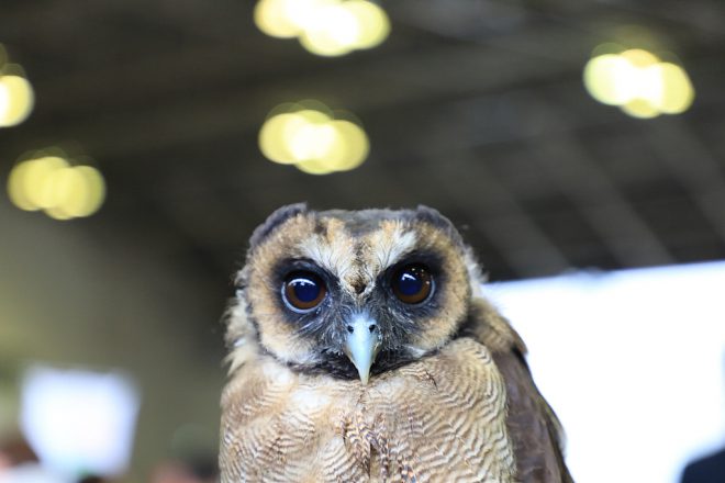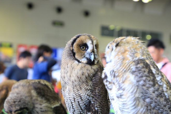 目と目(こっちはカメラですが)が合うとちょっとドキッ(笑)。よくみると、とっても可愛いです。犬や猫とはちょっと違うペットとして、人気があるのもわかるような気がします。フクロウカフェだってどこも大人気ですから。この日は、猛禽フライトショーなるイベントでも注目を集めていました。