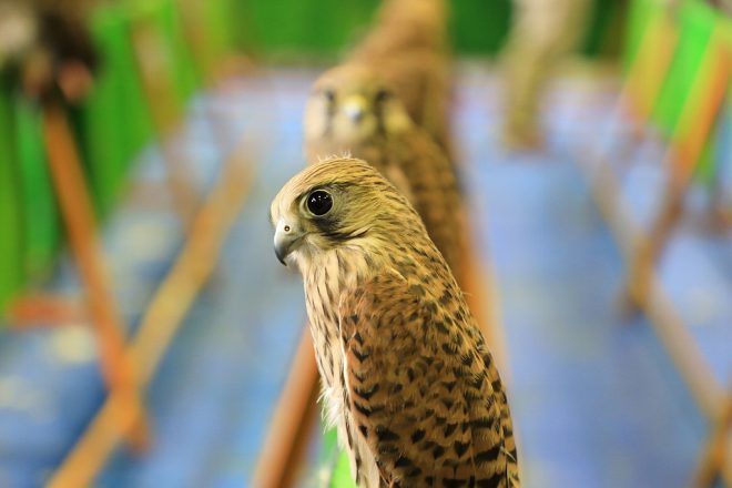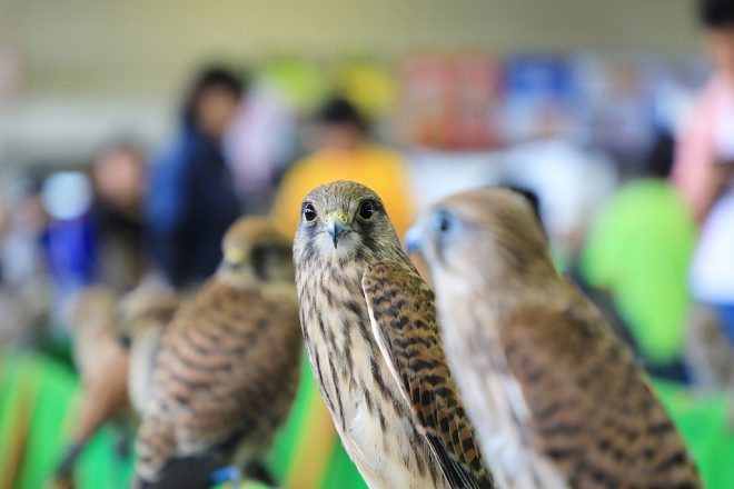 爬虫類イベントではすっかりおなじみの猛禽屋さん。茨城県が本拠地ですが、全国のイベントに出展。この日もブースには35万円もする「最強の鳥」といわれるアメリカワシミミズクや、ハヤブサの仲間であり可愛い表情をみせるチョウゲンボウなどの猛禽類が多数展示販売されていました。
