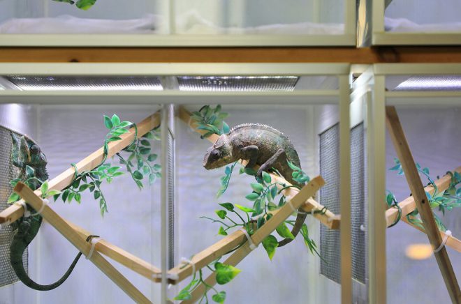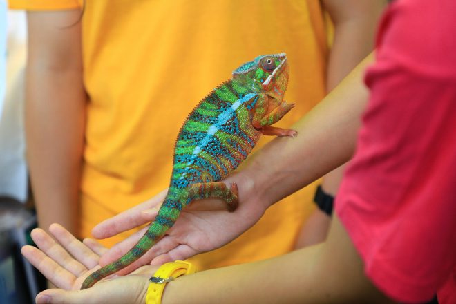 色鮮やかなカメレオンにも注目が集まっていました。昨今、その人気はトカゲやイグアナに押されている感がありますが、ある意味爬虫類の中では古典的人気を保っています。