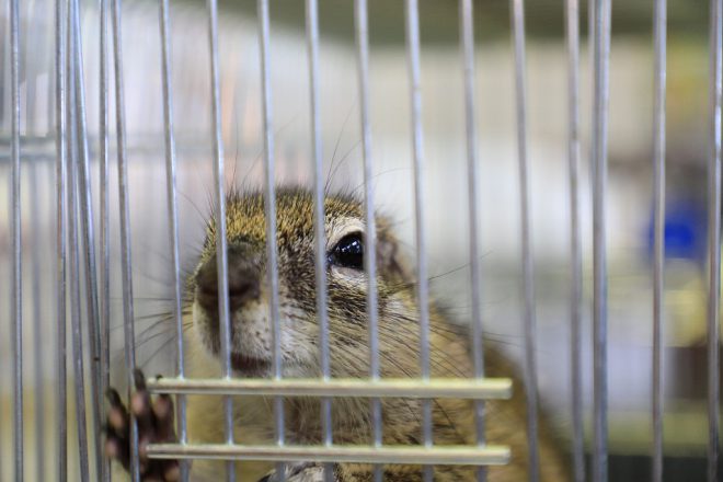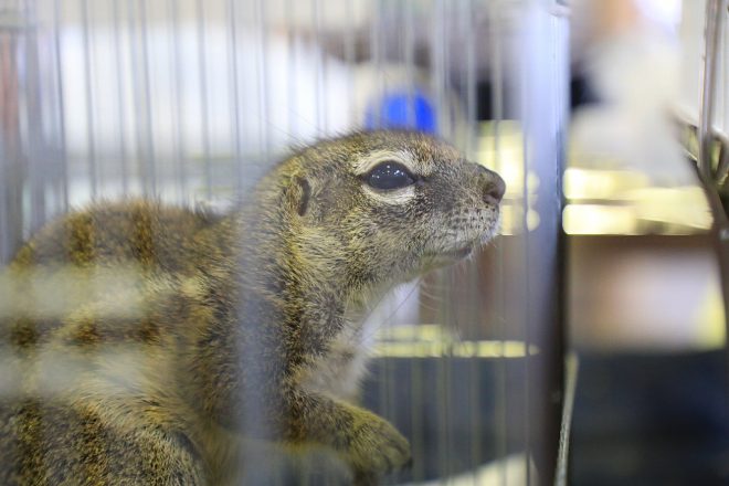 地元のショップ・テトさんのケージの一角には、国内で3匹しかいないというリス科のケープアラゲジリスがいました。南アフリカなどに生息中で、もしかしたら近いうちにブレイクするかも。
