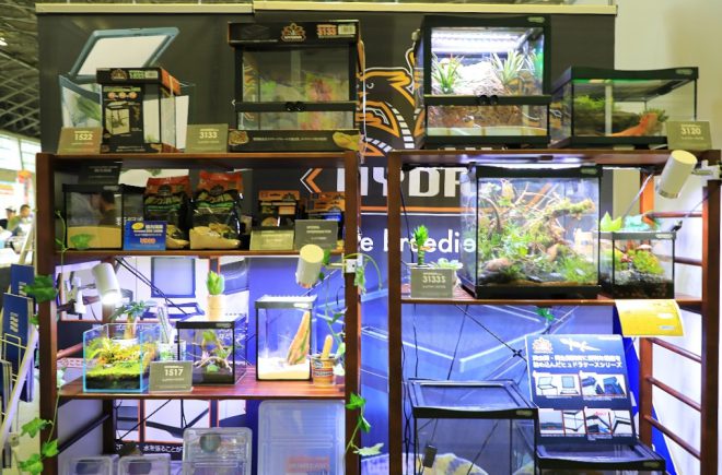 展示されていたのは、すっかりおなじみになった爬虫類用飼育ケース「ヒュドラ」の各種ラインナップ。大小さまざまなサイズが揃っています。トビラやフタなどの形状が微妙に異なるものもあり、飼育する生体や用途によって使い分けられます。やっぱり場所がいいだけに、来場者の目に止まりやすい感じです。ブランド・ヒュドラ、強し(笑)