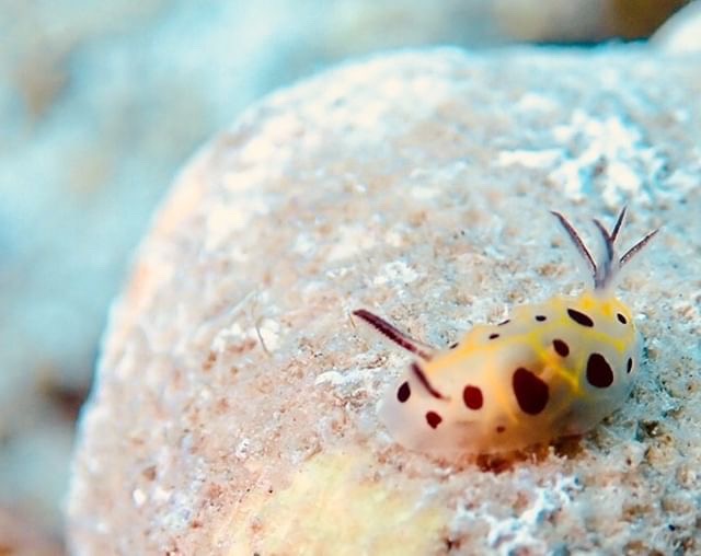 そして、テンテンウミウシ。ちょっとこれ、かわいすぎません(笑)?2〜3cmほどの小さいウミウシで、黒いドット模様と黄色い亀甲模様が特徴。岩場でよく見かけます。