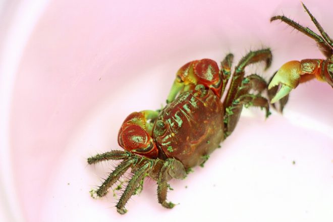 おお~、本日第1号の成果ともいうべき遭遇。もうこれだけでも十分興奮してしまいました(笑)。道路の側溝にいたのは、アカテガニ。その名の通り、手が赤いカニ。何と、あのさるかに合戦に登場するのも、このカニなのだそう。