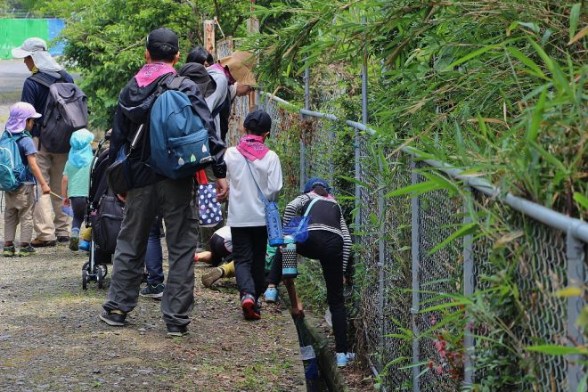 観察会の現地へ向かうべく、しばらくこの道を歩きます。この付近はみさき公園の裏手あたりになります。すると、何やら参加者の子どもたちの歓声が。一体、何をみつけたのでしょうか。