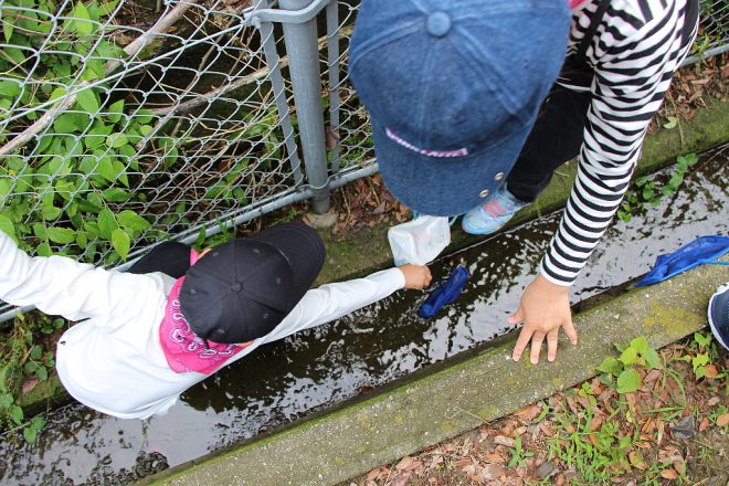 生きものとの別れを惜しむ子どもたち。そろそろ水位も増しはじめ、やがて満潮へ。楽しかった観察会のひとときも終わり、お気に入りの生きものたちともこれでお別れ。連れて帰れないからちょっと寂しいけど、また干潮の時にくるからね。それまで元気でいてね。