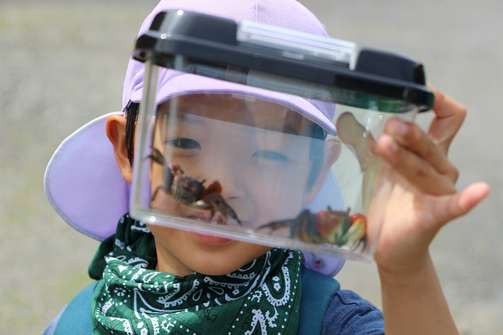 どんなカニなのかと聞いてみると、普段は山に棲んでいるカニなのに7月の大潮の日に産卵のために海に出て、子どもの時期を海ですごし大人になるとまた山に帰っていくのだそうです。へえ~、目からウロコ(笑)。残念ながら海では生きられないので、採取はNG。残念だけど、これも自然や生きものを末永く守っていくため。子どもたちはみんなわかってくれました。キミたちは偉い(笑)!