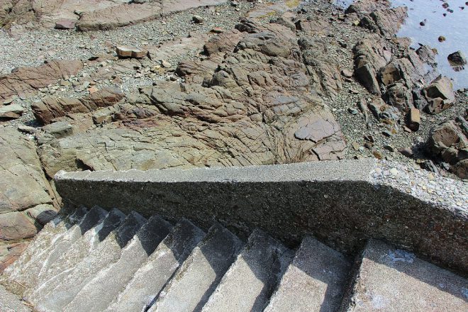 ほんの数カ所にだけ、磯へ降りられる石段がありました。付近には遊泳禁止や捕獲禁止といった看板はありませんが、そんなこといわれなくてもわかってますよね(笑)
