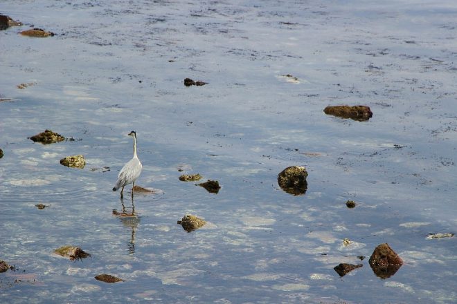 サギなんかも磯遊び中。川や田んぼでみかけることがありますが、魚をとりに海まで羽根をのばすことは珍しくないそうです。帽子も被ってないんだから、くれぐれも熱中症にはお気をつけて(笑)