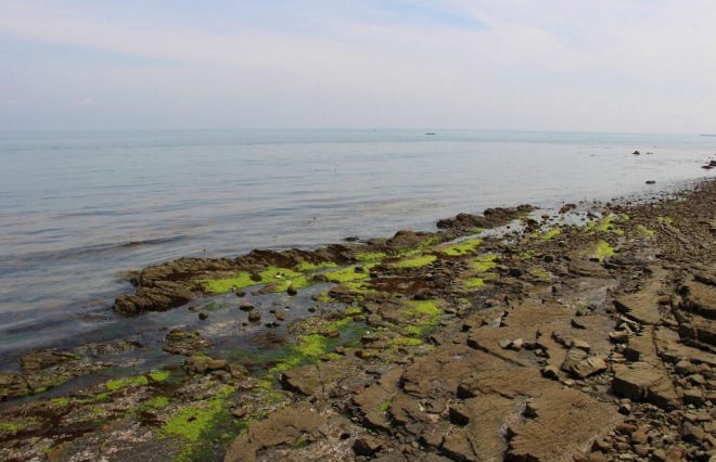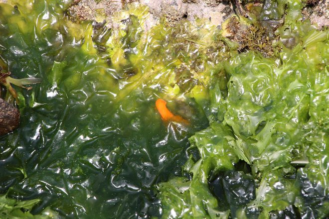 眼下に広がるのは海藻類。まさに干潮ならではの光景です。遠くからみると、ついついコケにみえてしまいます(笑)