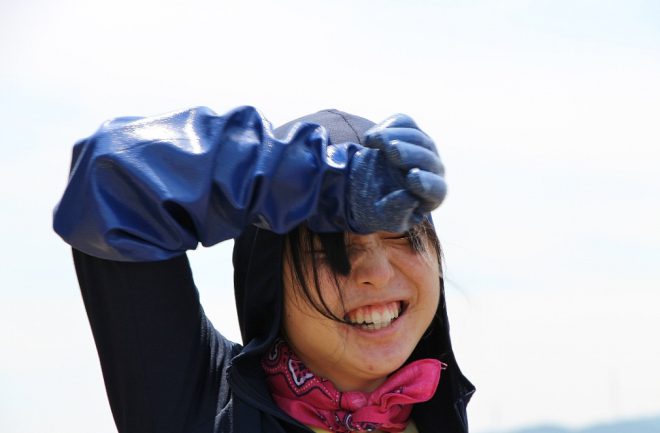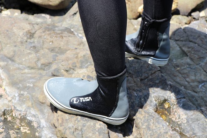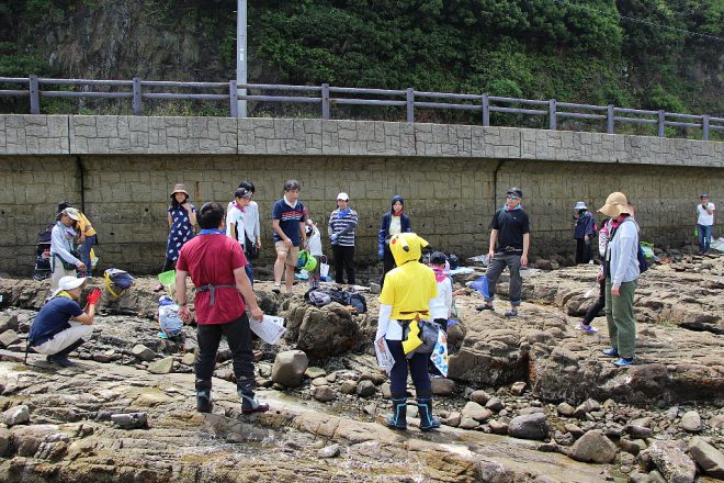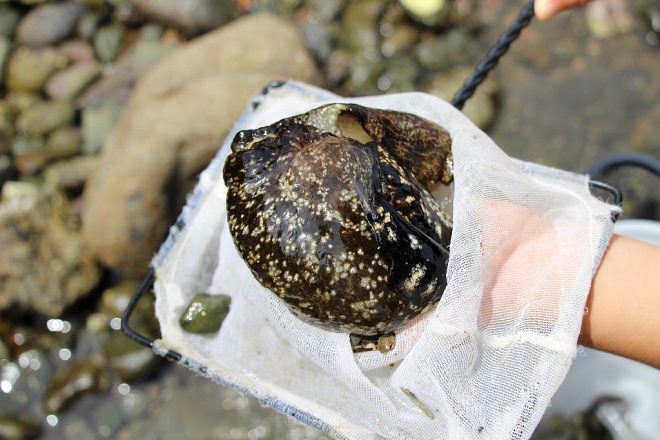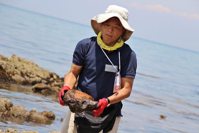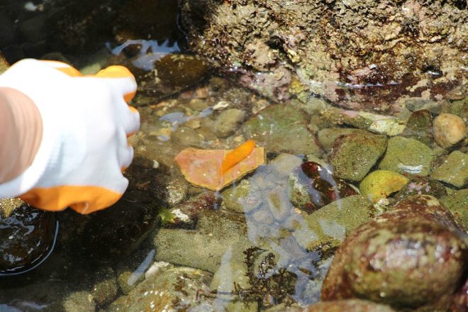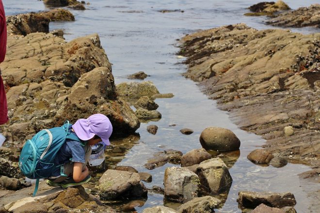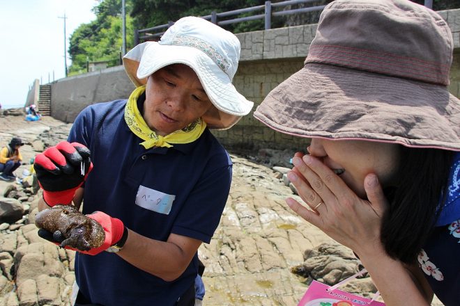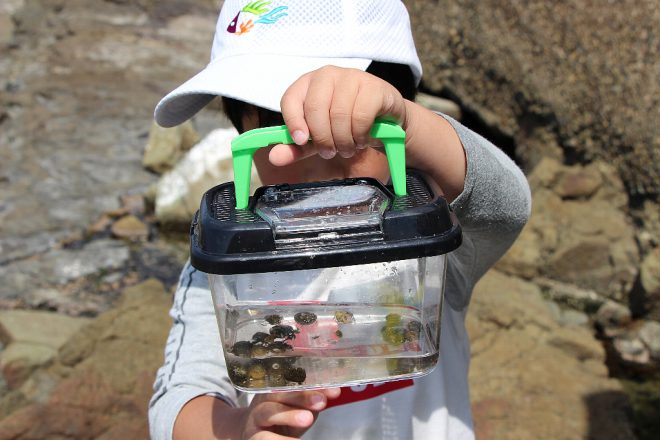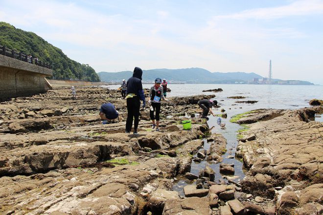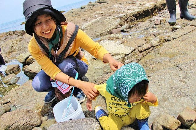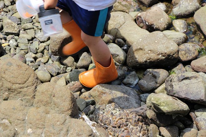 参加者の足元をみると、大人も子どもも長靴やマリンシューズが目立ちます。そう、ここはあくまで海の岩場。はしゃぎすぎて油断すると、擦り傷や滑って転倒という可能性がなきにしもあらず。滑りやすいビーチサンダルや、防水加工のないスニーカーなどは不向きです。
